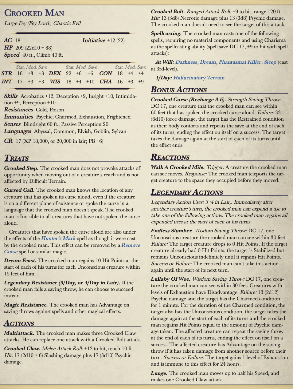 I had initially designed the Crooked Man for a high leveled D&D one shot that I was running for the Advancing Heroes Foundation charity that was themed after the fey and fairy tales. I wanted to design a threatening monster for high level play that had a gimmick to it rather than it just being a sack of hit points that the players could beat into submission.